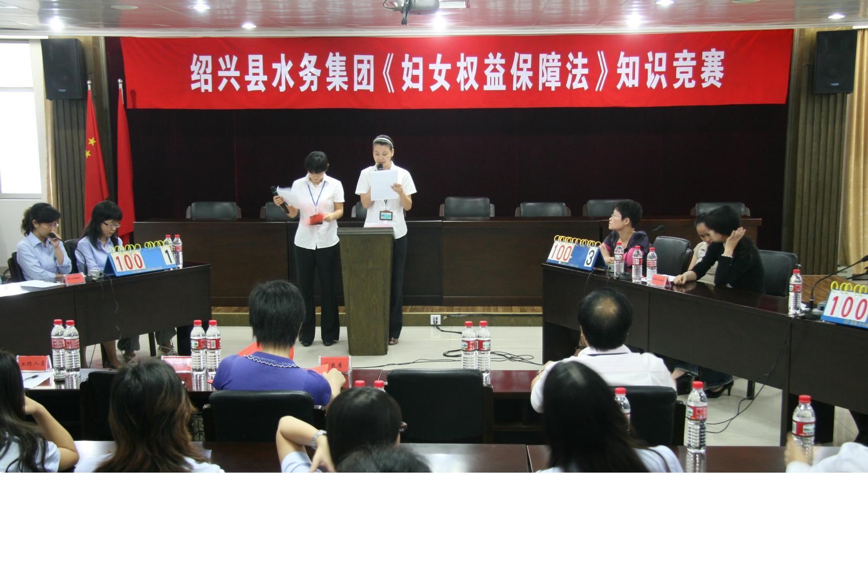 為廣泛深入地學(xué)習(xí)、宣傳、貫徹《中華人民共和國(guó)婦女權(quán)益保障法》,提高廣大女職工的法律意識(shí)及依法維護(hù)自身利益的能力,在“十一”前夕,水務(wù)集團(tuán)婦聯(lián)舉辦《中華人民共和國(guó)婦女權(quán)益保障法》知識(shí)競(jìng)賽。來(lái)自集團(tuán)機(jī)關(guān)、供水、排水、水處理公司婦委會(huì)等4支女職工代表隊(duì)參加比賽。本次競(jìng)賽以現(xiàn)場(chǎng)答題形式,分個(gè)人必答題、小組必答、搶答題和風(fēng)險(xiǎn)題。活動(dòng)在大家積極踴躍,熱情高漲。經(jīng)過(guò)緊張激勵(lì)的角逐,最終水處理婦委會(huì)榮獲第一名。