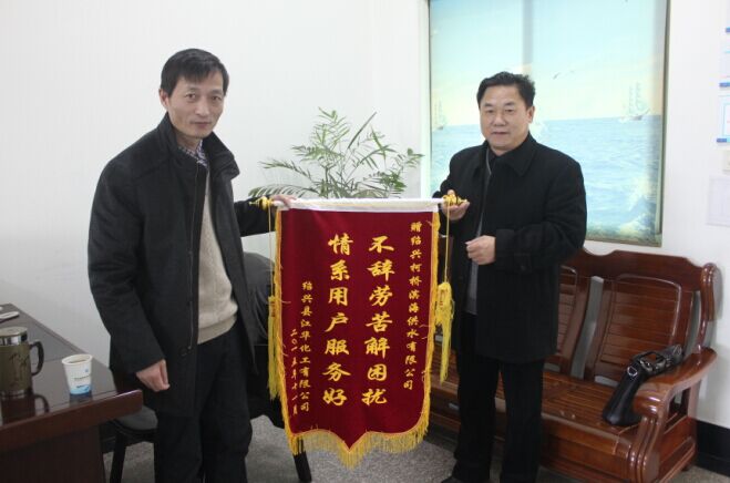 11月30日,紹興江華化工有限公司負責人來到公司,送來 “不辭辛勞解困擾,情系用戶服務好”的錦旗,對濱海供水公司長期以來為企業(yè)解決難題,營造良好的供水環(huán)境,提供高效的服務支持過程中表現(xiàn)出來的管理高水平、人員高素質(zhì)、工作高效率表示深深感謝。